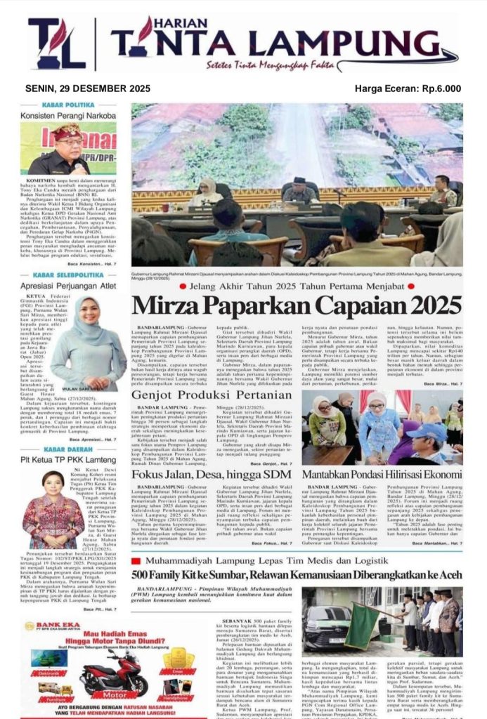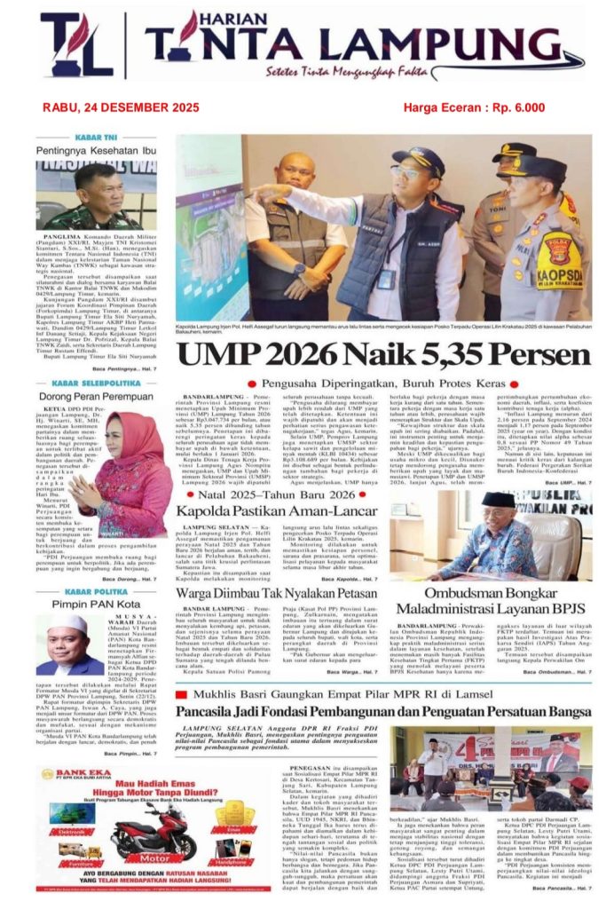 Uncategorized E-PAPAPER HARIAN TINTA LAMPUNG Redaksi Harian Tinta Lampung 3 bulan ago (Last updated: 3 bulan ago) 1 minute read 0 comments E-PAPER Senin 29 Desember 2025 Oplus_131072 E-PAPAER 22-Desember-2025 Oplus_131072 About the Author Redaksi Harian Tinta Lampung Administrator Visit Website View All Posts Post navigation Previous: Selain A.Novriwan JMSI Lampung juga tetapkan Rahmat Mirzani Djausal Sebagai Pembina JMSI LampungNext: Terpilih Secara Aklamasi Arnando Ferdiansyah Nahkodai DPD partai Golkar Lampung Utara Tinggalkan Balasan Batalkan balasanAlamat email Anda tidak akan dipublikasikan. Ruas yang wajib ditandai *Komentar * Nama * Email * Situs Web Simpan nama, email, dan situs web saya pada peramban ini untuk komentar saya berikutnya. Related Stories Lampung Uncategorized Resmi terbentuk DPD PJI-D Lampung: Lia Damayanti, S.Pd, Nahkodai DPD PJI- Demokrasi Lampung Redaksi Harian Tinta Lampung 2 minggu ago 0 Bandar Lampung Uncategorized Agenda Id Padat Pelantikan Pengurus JMSI Lampung Di undur Redaksi Harian Tinta Lampung 3 minggu ago 0 Lampung Lampung Barat Uncategorized Wakil Bupati Lampung Barat Lantik Tiga Pejabat Administrator Redaksi Harian Tinta Lampung 2 bulan ago 0